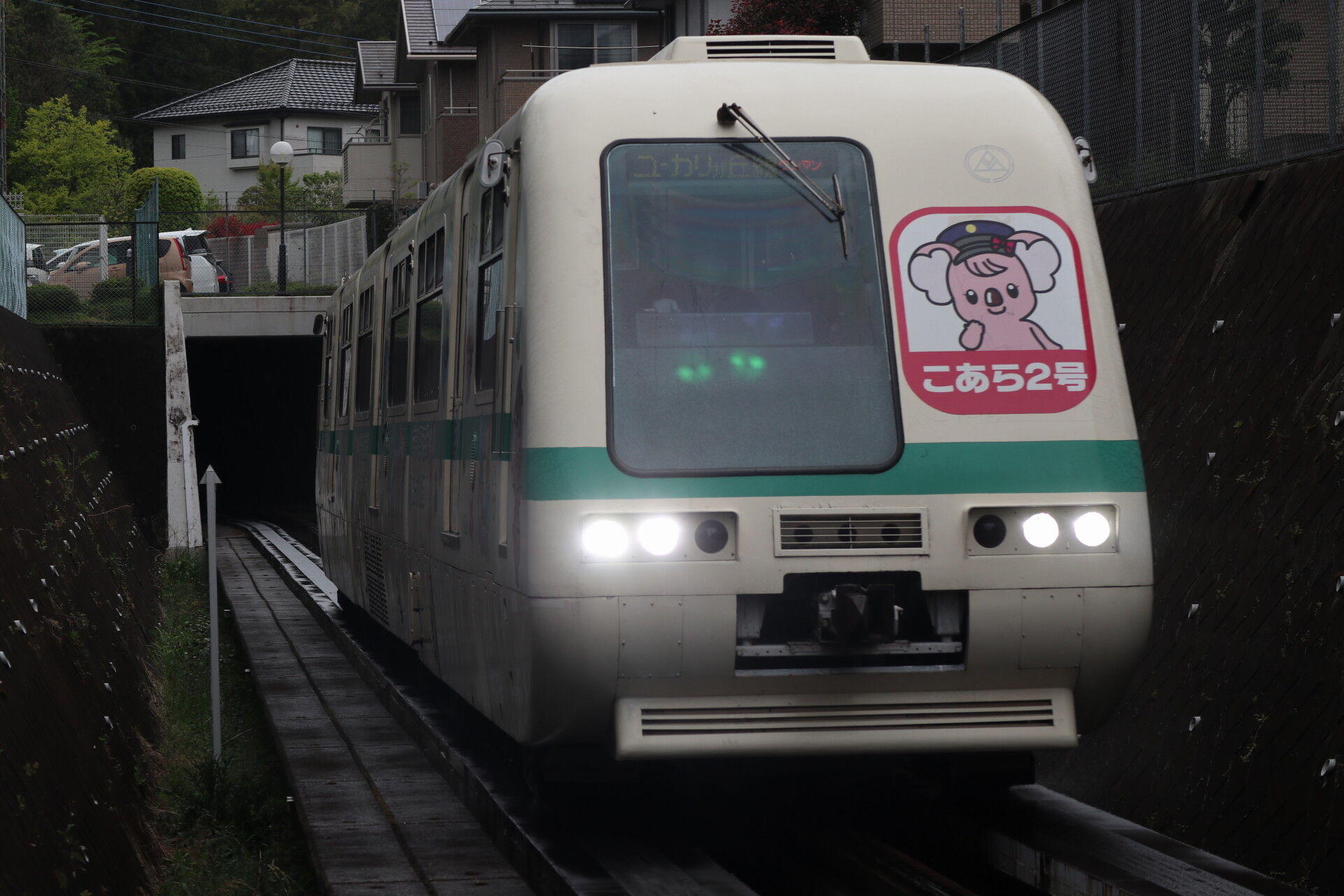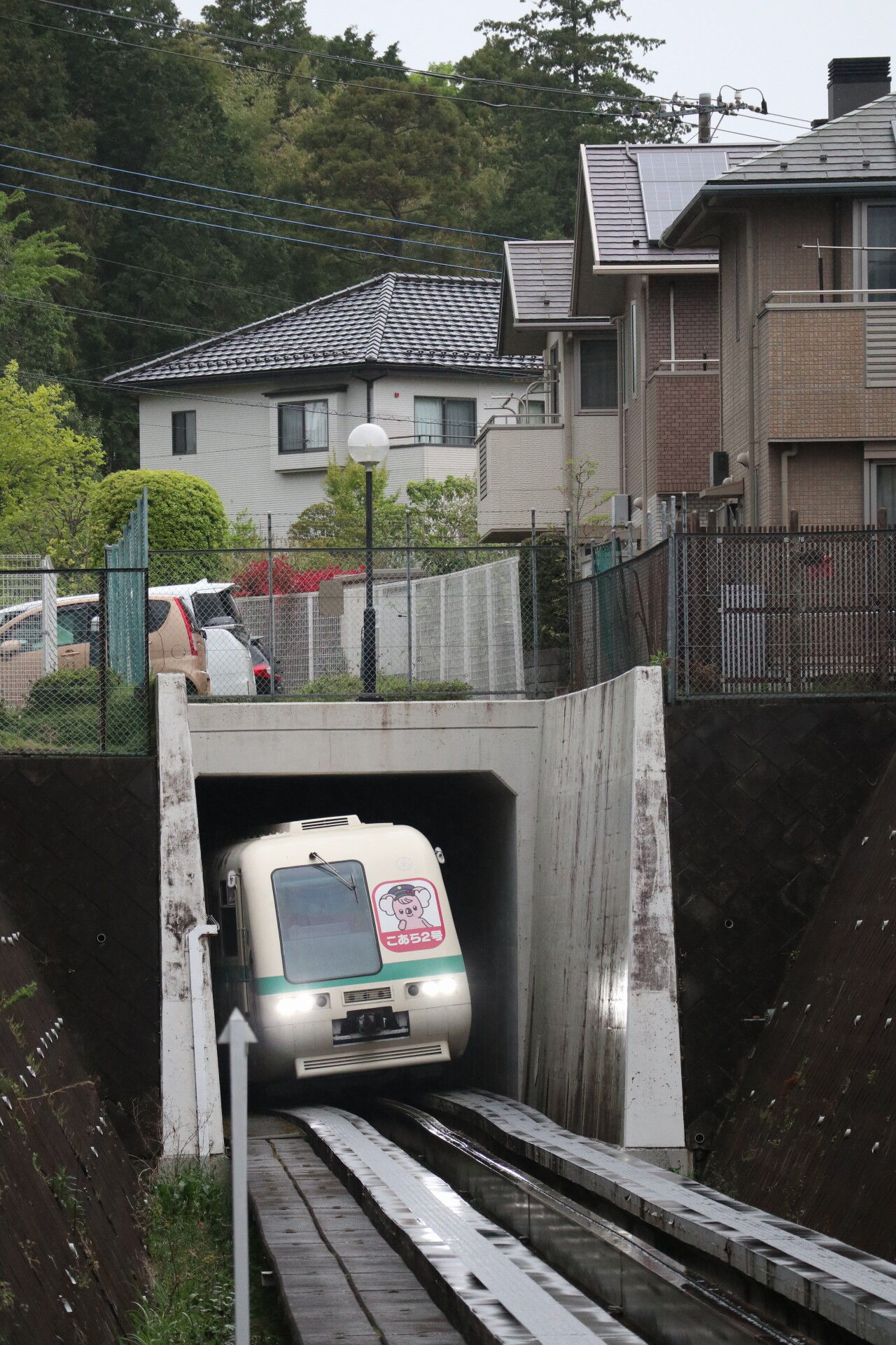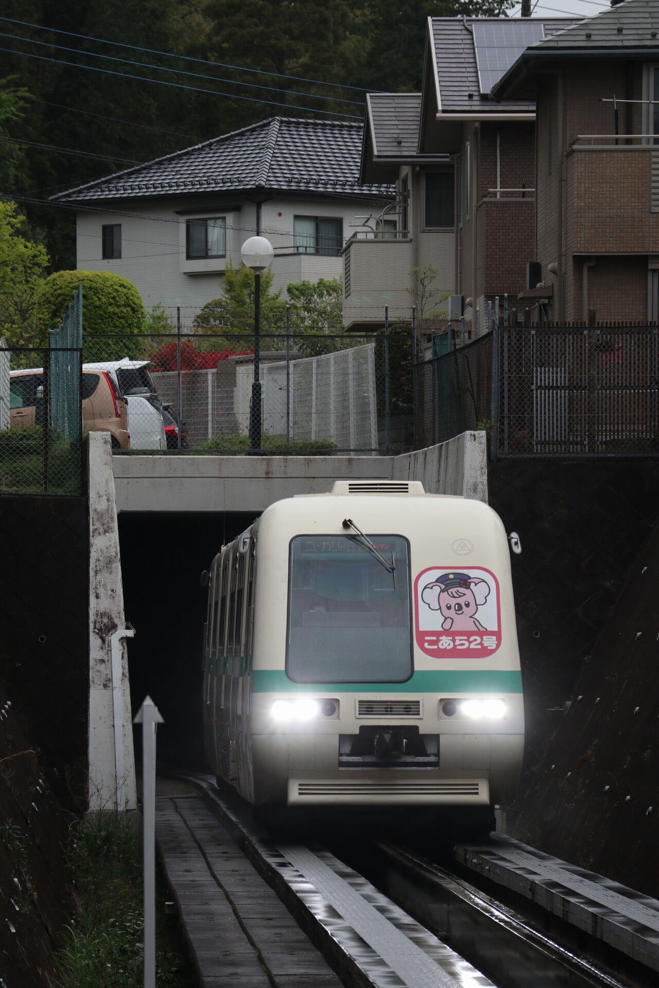 次の電車はユーカリが丘線唯一のトンネルの中から飛び出します。